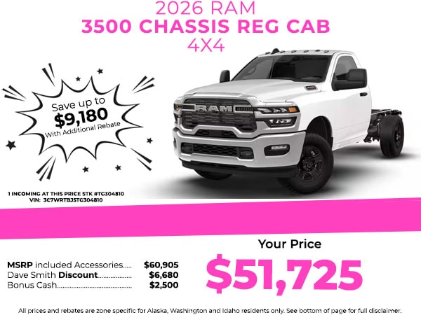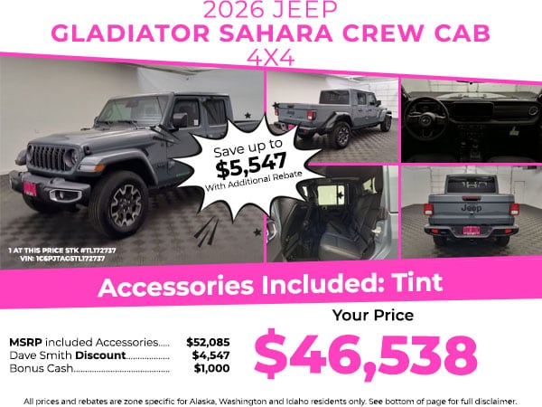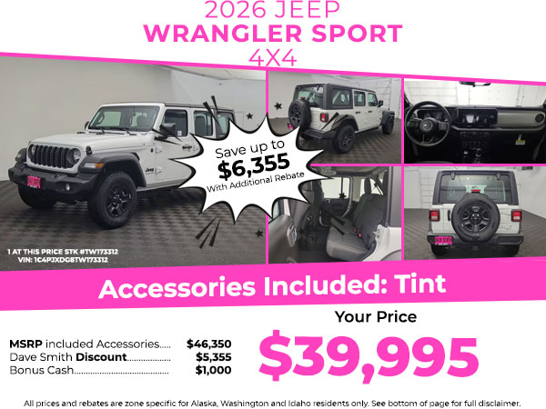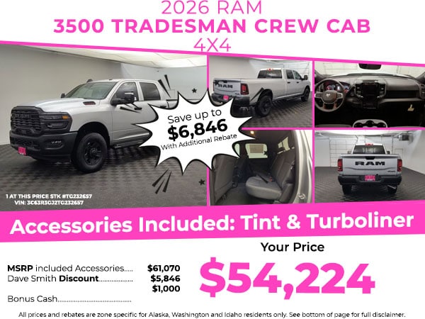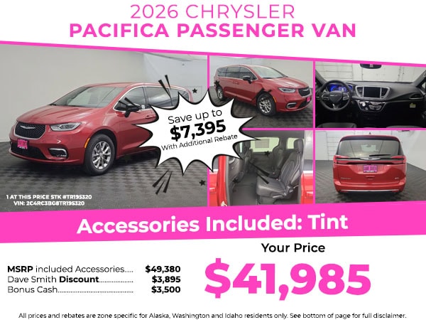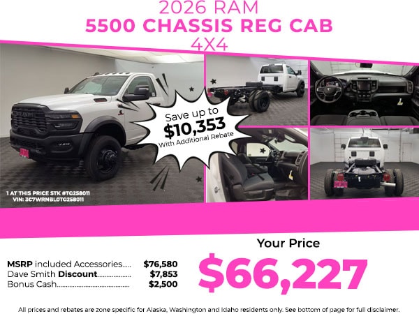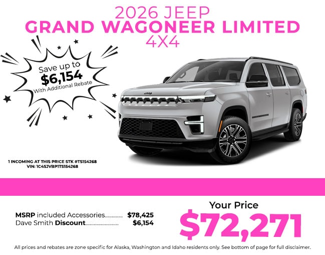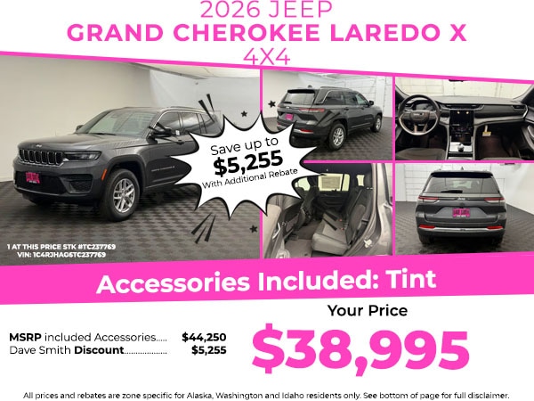 Prices shown are good for Idaho, Washington and Alaska residents only. Call dealer for rebates and pricing for different states. Not all customers will qualify for all rebates. All vehicles are subject to prior sale. Rebates as of 3/03/2026 and ad expires 3/31/2026 barring manufacturer rebate changes. Manufacturer retains the right to change incentives without notice, other restrictions apply. **Customer must finance through Stellantis Financial Services. Special APR financing offers may not be combined with disounted pricing or other promotional offers. *The Conquest vehicle must meet all eligable requirements. Customers may be eligible for either the discounted price or the special APR financing, but not both.  Not responsible for typographical errors. Prices/payments are plus tax, license & negotiable $549.00 Dealer Documentation fee. File photos, not actual photos. Limit 1 per customer or up to dealer discretion. No sales to dealers, brokers or anyone who buys for the sole purpose of resale or export sales. The definition of hassle free buying is the customer choice to buy without the hassle of negotiating. See dealer for details.
