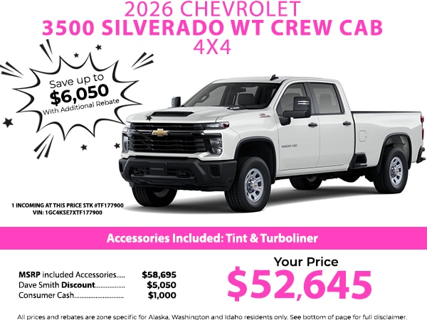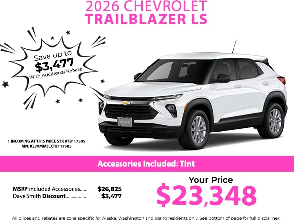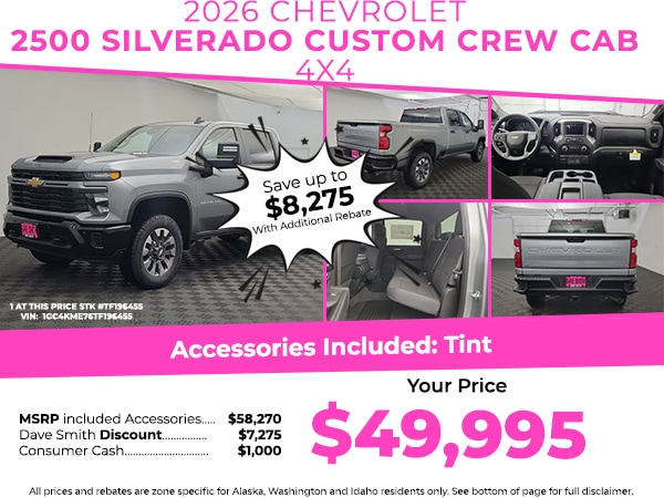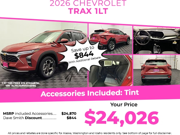 Prices shown are good for Idaho, Washington and Alaska residents only. Not actual photo, file photo. Call dealer for rebates and pricing for different states. Not all customers will qualify for all rebates. All vehicles are subject to prior sale. Rebates as of 1/03/2025 and ad expires 2/02/2026 barring manufacturer rebate changes. Manufacturer retains the right to change incentives without notice, other restrictions apply. Chevrolet and GMC are registered trademarks of General Motors Corporation. Vehicle Identification numbers posted in dealership and are available upon request. Not responsible for typographical errors. Prices/payments are plus tax, license & negotiable $549.00 Dealer Documentation fee. File photos, not actual photos. Limit 1 per customer or up to dealer discretion. No sales to dealers, brokers or anyone who buys for the sole purpose of resale or export sales. Trade in allowance requires customer to trade in their qualifying vehicle to be eligible for this incentive. The definition of hassle free buying is the customer choice to buy without the hassle of negotiating. Contact dealer for details.