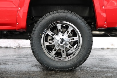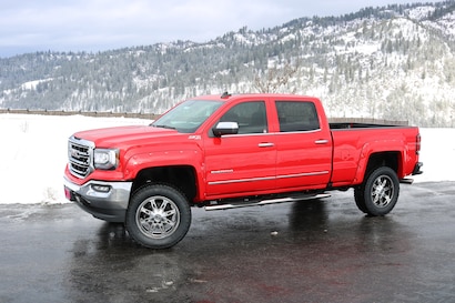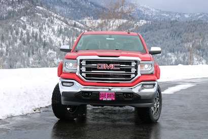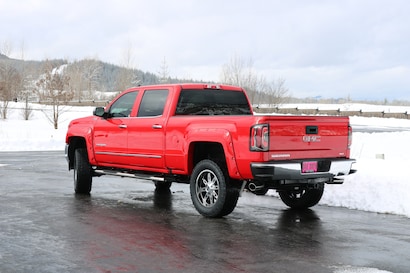 This Sierra is equipped with painted to match pocket fender flares, a PLS body lift, a leveling kit, Turboliner, dual exhaust tips, stainless side steps, and tint.
