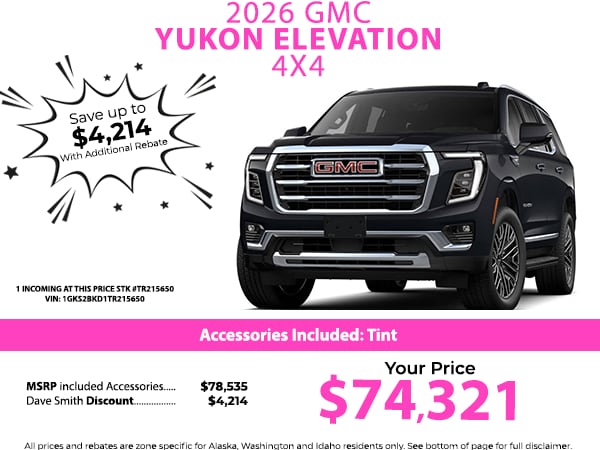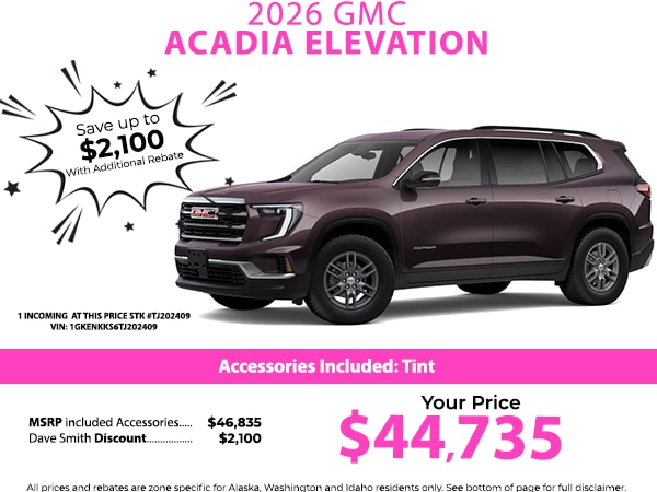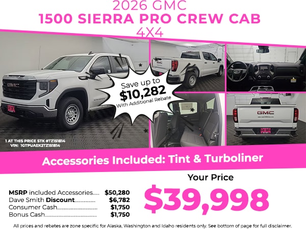 Prices shown are good for Idaho, Washington and Alaska residents only. Not actual photo, file photo. Call dealer for rebates and pricing for different states. Not all customers will qualify for all rebates. All vehicles are subject to prior sale. Rebates as of 1/03/2026 and ad expires 2/02/2026 barring manufacturer rebate changes. Manufacturer retains the right to change incentives without notice, other restrictions apply. Chevrolet and GMC are registered trademarks of General Motors Corporation. Vehicle Identification numbers posted in dealership and are available upon request. Not responsible for typographical errors. Prices/payments are plus tax, license & negotiable $549.00 Dealer Documentation fee. File photos, not actual photos. Limit 1 per customer or up to dealer discretion. No sales to dealers, brokers or anyone who buys for the sole purpose of resale or export sales. Trade in allowance requires customer to trade in their qualifying vehicle to be eligible for this incentive. The definition of hassle free buying is the customer choice to buy without the hassle of negotiating. Contact dealer for details.