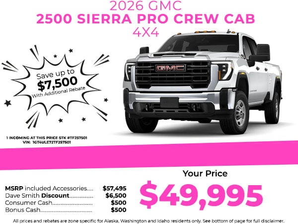 Prices shown are good for Idaho, Washington and Alaska residents only. Not actual photo, file photo. Call dealer for rebates and pricing for different states. Not all customers will qualify for all rebates. All vehicles are subject to prior sale. Rebates as of 3/03/2026 and ad expires 3/31/2026 barring manufacturer rebate changes. Manufacturer retains the right to change incentives without notice, other restrictions apply. Chevrolet and GMC are registered trademarks of General Motors Corporation. Vehicle Identification numbers posted in dealership and are available upon request. Not responsible for typographical errors. Prices/payments are plus tax, license & negotiable $549.00 Dealer Documentation fee. File photos, not actual photos. Limit 1 per customer or up to dealer discretion. No sales to dealers, brokers or anyone who buys for the sole purpose of resale or export sales. Trade in allowance requires customer to trade in their qualifying vehicle to be eligible for this incentive. The definition of hassle free buying is the customer choice to buy without the hassle of negotiating. Contact dealer for details.