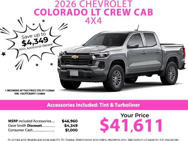 The installed navigation system will keep you on the right path. Start the Chevrolet Colorado from inside with remote start. Protect this unit from unwanted accidents with a cutting edge backup camera system. The state of the art park assist system will guide you easily into any spot. The Chevrolet Colorado offers Apple CarPlay for seamless connectivity. This Chevrolet Colorado keeps you comfortable with Auto Climate. This 2026 Chevrolet Colorado 's Lane Departure Warning keeps you safe by alerting you when you drift from your lane. Bluetooth technology is built into this Chevrolet Colorado, keeping your hands on the steering wheel and your focus on the road. This model stays safely in its lane with Lane Keep Assist. This 2026 Chevrolet Colorado offers Android Auto for seamless smartphone integration. The vehicle emanates grace with its stylish gray exterior. This vehicle has four wheel drive capabilities. Set the temperature exactly where you are most comfortable in the Chevrolet Colorado. The fan speed and temperature will automatically adjust to maintain your preferred zone climate.