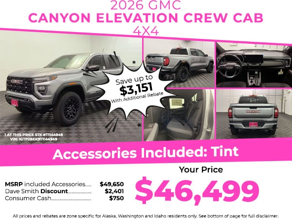 This GMC Canyon has auto-adjust speed for safe following. This vehicle offers Android Auto for seamless smartphone integration. This model offers Apple CarPlay for seamless connectivity. This vehicle features a hands-free Bluetooth phone system. This vehicle's Lane Departure Warning helps keep you in your lane. You'll never again be lost in a crowded city or a country region with the navigation system on this GMC Canyon. Start the GMC Canyon from inside with remote start. The vehicle keeps you comfortable with Auto Climate. Lane Keep Assist in this model helps maintain safe driving by gently steering to stay within the lane. See what's behind you with the back up camera on this small pickup. This model emanates grace with its stylish gray exterior. This 2026 GMC Canyon has a 4 Cyl, 2.7L high output engine. Set the temperature exactly where you are most comfortable in this 2026 GMC Canyon . The fan speed and temperature will automatically adjust to maintain your preferred zone climate.