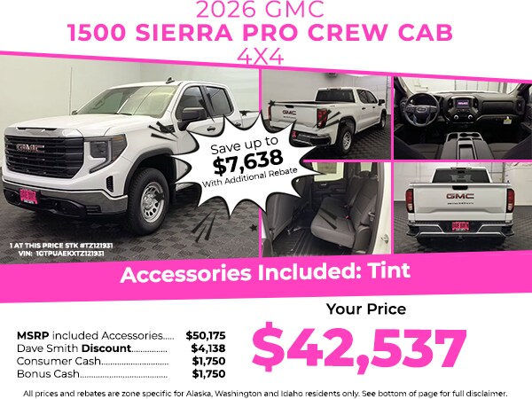Convenience Package: LED Cargo Area Lighting; EZ Lift Power Lock and Release Tailgate; Deep-Tinted Glass; Electric Rear-Window Defogger; Heated Power-Adjustable Outside Mirrors. Pro Value Package: Trailering Package. Preferred Equipment Group 1SA: OnStar Services Capable; HD Rear Vision Camera; Power Front Windows with Passenger Express Down; Remote Keyless Entry; 17" X 8" Silver Painted Steel Wheels; Solar Absorbing Tinted Glass; 220 Amp Alternator; Chrome Header with Flat Black Grille Insert Bars; Power Rear Windows with Express Down; Single Speed Transfer Case; Power Front Windows with Driver Express Up/down; GMC Pro Safety; Front Frame-Mounted Black Recovery Hooks; Wi-Fi Hotspot Capable; Push Button Start; Front 40/20/40 Split-Bench Seat; TurboMax Engine; 2 Charge/data USB Ports; Power Door Locks. Spray-On Pickup Bedliner. Trailering Package. Electric Rear-Window Defogger. Deep-Tinted Glass. EZ Lift Power Lock and Release Tailgate. LED Cargo Area Lighting. **Equipment listed is based on original vehicle build and subject to change. Please confirm the accuracy of the included equipment by calling the dealer prior to purchase.**