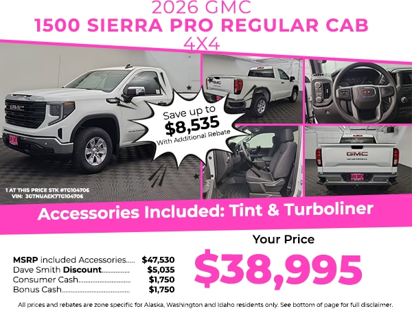 Convenience Package: LED Cargo Area Lighting; EZ Lift Power Lock and Release Tailgate; Deep-Tinted Glass; Electric Rear-Window Defogger. Pro Value Package: Trailering Package. 1SA Safety Plus Package: Rear Cross Traffic Braking; Ultrasonic Front and Rear Park Assist; Perimeter Lighting; Lane Change Alert with Side Blind Zone Alert; Chrome Mirror Caps. Preferred Equipment Group 1SA: OnStar Services Capable; HD Rear Vision Camera; Power Front Windows with Passenger Express Down; Remote Keyless Entry; Solar Absorbing Tinted Glass; 220 Amp Alternator; Chrome Header with Flat Black Grille Insert Bars; Single Speed Transfer Case; Power Front Windows with Driver Express Up/down; GMC Pro Safety; Front Frame-Mounted Black Recovery Hooks; Wi-Fi Hotspot Capable; Push Button Start; Front 40/20/40 Split-Bench Seat; TurboMax Engine; 2 Charge/data USB Ports; Power Door Locks. Trailering Package. 17" X 8" Bright Silver Painted Aluminum Wheels. Integrated Trailer Brake Controller. 120-Volt Interior Power Outlet. Electric Rear-Window Defogger. Deep-Tinted Glass. EZ Lift Power Lock and Release Tailgate. LED Cargo Area Lighting. **Equipment listed is based on original vehicle build and subject to change. Please confirm the accuracy of the included equipment by calling the dealer prior to purchase.**