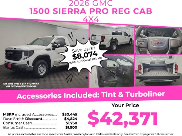 Convenience Package: LED Cargo Area Lighting; EZ Lift Power Lock and Release Tailgate; Deep-Tinted Glass; Electric Rear-Window Defogger. Pro Value Package: Trailering Package. 1SA Safety Plus Package: Rear Cross Traffic Braking; Ultrasonic Front and Rear Park Assist; Perimeter Lighting; Lane Change Alert with Side Blind Zone Alert; Chrome Mirror Caps. Preferred Equipment Group 1SA: OnStar Services Capable; HD Rear Vision Camera; Power Front Windows with Passenger Express Down; Remote Keyless Entry; 17" X 8" Silver Painted Steel Wheels; Solar Absorbing Tinted Glass; 220 Amp Alternator; Chrome Header with Flat Black Grille Insert Bars; Single Speed Transfer Case; Power Front Windows with Driver Express Up/down; GMC Pro Safety; Front Frame-Mounted Black Recovery Hooks; Wi-Fi Hotspot Capable; Push Button Start; Front 40/20/40 Split-Bench Seat; 2 Charge/data USB Ports; Power Door Locks. Auto-Locking Rear Differential. Trailering Package. 120-Volt Interior Power Outlet. Electric Rear-Window Defogger. Deep-Tinted Glass. EZ Lift Power Lock and Release Tailgate. LED Cargo Area Lighting. **Equipment listed is based on original vehicle build and subject to change. Please confirm the accuracy of the included equipment by calling the dealer prior to purchase.**