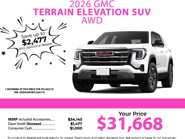 Start this GMC Terrain from inside with remote start. This vehicle offers Automatic Climate Control for personalized comfort. The GMC Terrain features a hands-free Bluetooth phone system. See what's behind you with the back up camera on this unit. Keep your hands warm all winter with a heated steering wheel in this vehicle . This mid-size suv has automated speed control that adjusts to maintain a safe following distance, enhancing highway driving convenience. The GMC Terrain's Lane Departure Warning keeps you safe by alerting you when you drift from your lane. The rear parking assist technology on this 2026 GMC Terrain will put you at ease when reversing. The system alerts you as you get closer to an obstruction. You'll never again be lost in a crowded city or a country region with the navigation system on this mid-size suv. This 2026 GMC Terrain stays safely in its lane with Lane Keep Assist.