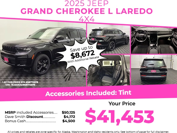 This vehicle offers Automatic Climate Control for personalized comfort. This model comes equipped with Android Auto for seamless smartphone integration on the road. This mid-size suv's Forward Collision Warning feature alerts drivers to potential front-end collisions. Protect this mid-size suv from unwanted accidents with a cutting edge backup camera system. Keep your hands warm all winter with a heated steering wheel in this Jeep Grand Cherokee L . Never get into a cold vehicle again with the remote start feature on this vehicle. This 2025 Jeep Grand Cherokee L features a hands-free Bluetooth phone system. The leather seats in the vehicle are a must for buyers looking for comfort, durability, and style. Apple CarPlay: Seamless smartphone integration for the vehicle - stay connected and entertained on the go! This vehicle has automated speed control that adjusts to maintain a safe following distance, enhancing highway driving convenience. Maintaining a stable interior temperature in this vehicle is easy with the climate control system.