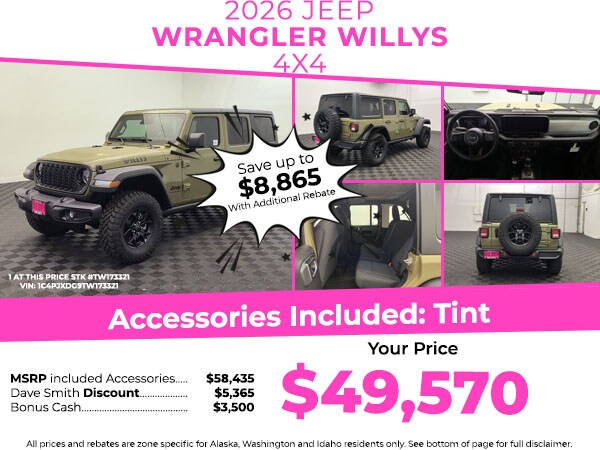 Keep your hands warm all winter with a heated steering wheel in this model . This 2026 Jeep Wrangler offers Android Auto for seamless smartphone integration. This mid-size suv offers Apple CarPlay for seamless connectivity. The vehicle keeps you comfortable with Auto Climate. The vehicle features a hands-free Bluetooth phone system. See what's behind you with the back up camera on this Jeep Wrangler. This model has automated speed control that adjusts to maintain a safe following distance, enhancing highway driving convenience. It's Forward Collision Warning feature alerts drivers to potential front-end collisions. Start this model from inside with remote start. An off-road package is equipped on the Jeep Wrangler. When you encounter slick or muddy roads, you can engage the four wheel drive on the vehicle and drive with confidence. Set the temperature exactly where you are most comfortable in this unit. The fan speed and temperature will automatically adjust to maintain your preferred zone climate.
