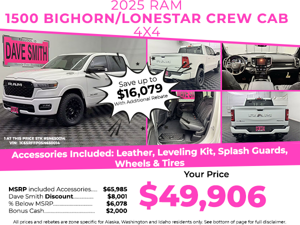 Big Horn Level 1 Equipment Group: 400W Inverter; Rear Window Defroster; Rear View Auto Dim Mirror; Power Adjustable Pedals; Leather Wrapped Steering Wheel; Rear Power Sliding Window; Exterior Mirrors with Supplemental Signals; Steering Wheel Mounted Audio Controls; Exterior Mirrors Courtesy Lamps; Glove Box Lamp; Auto Power-Folding Mirrors; Exterior Mirrors with Heating Element; Auto Dim Exterior Driver Mirror; 115V Auxiliary Power Outlet; Universal Garage Door Opener; Heated Front Seats; Heated Steering Wheel; Black Exterior Mirrors; Power Adjust 8-Way Driver Seat; 2nd Row in Floor Storage Bins; Convex Wide-Angle Exterior Mirror Insert; Black Premium Power Mirrors; Sun Visors with Illuminated Vanity Mirrors; Power 2-Way Driver Lumbar Adjust. Sport Appearance Package: Deluxe Cloth Bucket Seats; Grille Surround 1 Body Color Texture 1 Black; Body Color Tailgate Handle; Black Interior Accents; Body Color Front Bumper; Body Color Door Handles; RAM Grille Badge - Chrome; Body Color Rear Bumper with Step Pads. Bed Utility Group: MOPAR Spray in Bedliner; MOPAR Deployable Bed Step; MOPAR 4 Adjustable Cargo Tie-Down Hooks; Pick-Up Box Lighting; Exterior 115V AC Outlet. Quick Order Package 21R Lone Star: Lone Star Badge. Deluxe Cloth Bucket Seats. Trailer Brake Control. MOPAR Front and Rear Rubber Floor Mats. 3.55 Rear Axle Ratio. **Equipment listed is based on original vehicle build and subject to change. Please confirm the accuracy of the included equipment by calling the dealer prior to purchase.**