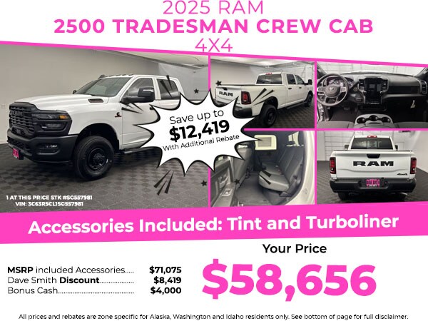 Cold Weather Group: Engine Block Heater; MOPAR Winter Front Grille Cover. Convenience Group. Quick Order Package 24A Tradesman. Tradesman Level 1 Equipment Group: Google Android Auto; SiriusXM Radio Service; Rear View Auto Dim Mirror; Rear Power Sliding Window; Integrated Voice Command with Bluetooth; Connectivity - US/Canada; Emergency Vehicle Alert System (EVAS); Manual Folding Exterior Mirrors; 12 Touchscreen Display; Tinted Acoustic Windshield Glass; GPS Navigation; 4G LTE Wi-Fi Hot Spot; GPS Antenna Input; Exterior Mirrors with Heating Element; MOPAR Black Tubular Side Steps; SiriusXM with 360L; Anti-Spin Differential Rear Axle; Global Telematics Box Module; Connected Travel and Traffic Services; Mirror Running Lights; Black Exterior Mirrors; Exterior 115V AC Outlet; Alexa Built-In; Carpet Floor Covering; Apple CarPlay; Power Adjustable Convex Aux Mirrors; Off-Road Info Pages; Selectable Tire Fill Alert; Trailer Tow Pages; 400W Inverter; Cloth 40/20/40 Bench Seat; Disassociated Touchscreen Display; HD Radio; Power Heated Folding Telescope Mirrors; Uconnect 5 Navigation with 12.0 Display Radio; Exterior Mirrors with Supplemental Signals; Exterior Mirrors Courtesy Lamps; Air Conditioning ATC with Dual Zone Control; 115-Volt Auxiliary Front Power Outlet; Manuarl Telescoping Mirrors; Power Adjust Mirrors; Front and Rear Floor Mats; ParkSense Front/rear Park Assist System. MOPAR Black Tubular Side Steps. Anti-Spin Differential Rear Axle. Cloth 40/20/40 Bench Seat. Instrument Panel Mounted Auxiliary Switches. Clearance Lamps. Transfer Case Skid Plate Shield. **Equipment listed is based on original vehicle build and subject to change. Please confirm the accuracy of the included equipment by calling the dealer prior to purchase.**