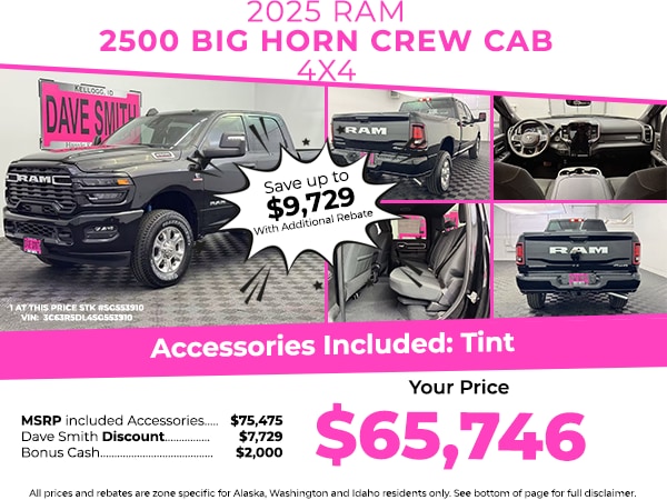This model offers Automatic Climate Control for personalized comfort. Never get into a cold vehicle again with the remote start feature on this 2025 Ram 2500 . The rear parking assist technology on the vehicle will put you at ease when reversing. The system alerts you as you get closer to an obstruction. This Ram 2500 is pure luxury with a heated steering wheel. The Ram 2500 offers Apple CarPlay for seamless connectivity. This vehicle has auto-adjust speed for safe following. Heated seats for those cold winter days are included in it. This model's Forward Collision Warning feature alerts drivers to potential front-end collisions. This model comes equipped with Android Auto for seamless smartphone integration on the road. This Ram 2500 features a hands-free Bluetooth phone system. An off-road package is equipped on it. with XM/Sirus Satellite Radio you are no longer restricted by poor quality local radio stations while driving this 3/4 ton pickup. Anywhere on the planet, you will have hundreds of digital stations to choose from.
