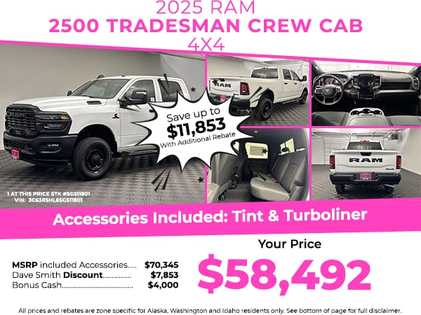 Cold Weather Group: Engine Block Heater; MOPAR Winter Front Grille Cover. Convenience Group. Quick Order Package 24A Tradesman. Tradesman Level 1 Equipment Group: Google Android Auto; SiriusXM Radio Service; Rear View Auto Dim Mirror; Rear Power Sliding Window; Integrated Voice Command with Bluetooth; Connectivity - US/Canada; Emergency Vehicle Alert System (EVAS); Manual Folding Exterior Mirrors; 12 Touchscreen Display; Tinted Acoustic Windshield Glass; GPS Navigation; 4G LTE Wi-Fi Hot Spot; GPS Antenna Input; Exterior Mirrors with Heating Element; MOPAR Black Tubular Side Steps; SiriusXM with 360L; Anti-Spin Differential Rear Axle; Global Telematics Box Module; Connected Travel and Traffic Services; Mirror Running Lights; Black Exterior Mirrors; Exterior 115V AC Outlet; Alexa Built-In; Carpet Floor Covering; Apple CarPlay; Power Adjustable Convex Aux Mirrors; Off-Road Info Pages; Selectable Tire Fill Alert; Trailer Tow Pages; 400W Inverter; Cloth 40/20/40 Bench Seat; Disassociated Touchscreen Display; HD Radio; Power Heated Folding Telescope Mirrors; Uconnect 5 Navigation with 12.0 Display Radio; Exterior Mirrors with Supplemental Signals; Exterior Mirrors Courtesy Lamps; Air Conditioning ATC with Dual Zone Control; 115-Volt Auxiliary Front Power Outlet; Manuarl Telescoping Mirrors; Power Adjust Mirrors; Front and Rear Floor Mats; ParkSense Front/rear Park Assist System. MOPAR Black Tubular Side Steps. Anti-Spin Differential Rear Axle. Cloth 40/20/40 Bench Seat. **Equipment listed is based on original vehicle build and subject to change. Please confirm the accuracy of the included equipment by calling the dealer prior to purchase.**
