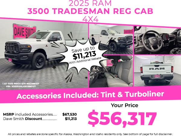 Cold Weather Group: Engine Block Heater; MOPAR Winter Front Grille Cover. Quick Order Package 24A Tradesman. Tradesman Level 1 Equipment Group: Convenience Group; Google Android Auto; SiriusXM Radio Service; Speed Sensitive Power Locks; Rear Sliding Window; Rear View Auto Dim Mirror; For Details Visit DriveUconnect.com; For More Info. Call 800-643-2112; Integrated Voice Command with Bluetooth; Upgraded Door Trim Panel; Connectivity - US/Canada; Emergency Vehicle Alert System (EVAS); Manual Folding Exterior Mirrors; 12 Touchscreen Display; Tinted Acoustic Windshield Glass; GPS Navigation; 4G LTE Wi-Fi Hot Spot; GPS Antenna Input; Exterior Mirrors with Heating Element; MOPAR Black Tubular Side Steps; Front 1-Touch Down Power Windows; SiriusXM with 360L; Active Noise Control System; Global Telematics Box Module; Connected Travel and Traffic Services; Mirror Running Lights; Black Exterior Mirrors; Alexa Built-In; Carpet Floor Covering; Apple CarPlay; Power-Adjustable Convex Aux Mirrors; Off-Road Information Pages; Selectable Tire Fill Alert; Trailer Tow Pages; Cloth 40/20/40 Bench Seat; Disassociated Touchscreen Display; HD Radio; Power Heat Fold Telescope Mirrors; Uconnect 5 Navigation with 12.0 Display Radio; Exterior Mirrors with Supplemental Signals; Exterior Mirrors Courtesy Lamps; Air Conditioning ATC with Dual Zone Control; 6 Speakers; Manuarl Telescoping Mirrors; Front Floor Mats; Power Adjust Mirrors; Remote Keyless Entry. Commercial Features Package: 400W Inverter; 115-Volt Auxiliary Front Power Outlet; Exterior 115V AC Outlet; ParkSense Front/rear Park Assist System. MOPAR Black Tubular Side Steps. Cloth 40/20/40 Bench Seat. **Equipment listed is based on original vehicle build and subject to change. Please confirm the accuracy of the included equipment by calling the dealer prior to purchase.**