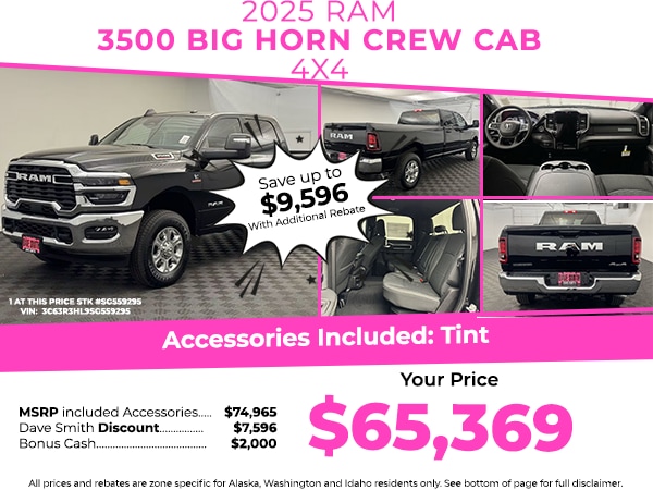 Big Horn Level 1 Plus Equipment Group: Google Android Auto; SiriusXM Radio Service; For Details Visit DriveUconnect.com; For More Info. Call 800-643-2112; Integrated Voice Command with Bluetooth; Emergency Vehicle Alert System (EVAS); Cloth 40/20/40 Premium Bench Seat; Glove Box Lamp; 12 Touchscreen Display; Auto Power-Folding Mirrors; Footwell Courtesy Lamp; Mirror Running Lights; MOPAR Deployable Bed Step; Alexa Built-In; Apple CarPlay; Power-Adjustable Convex Aux Mirrors; Forward and Reverse Utility Lights; Locking Lower Glove Box; Remote Start System; 9 Alpine Speakers with Subwoofer; Dual Glove Boxes; 2nd Row in Floor Storage Bins; Rear View Auto Dim Mirror; Rear Dome with On/off Switch Lamp; LED Bed Lighting; Connectivity - US/Canada; GPS Navigation; 4G LTE Wi-Fi Hot Spot; GPS Antenna Input; Exterior Mirrors with Heating Element; SiriusXM with 360L; Global Telematics Box Module; Connected Travel and Traffic Services; Foam Bottle Insert (door Trim Panel); Black Exterior Mirrors; Big Horn Instrument Panel Badge; Off-Road Information Pages; Selectable Tire Fill Alert; Trailer Tow Pages; HD Radio; Uconnect 5 Navigation with 12.0 Display Radio; Power Heated Fold Telescopic Mirrors; Exterior Mirrors with Supplemental Signals; Steering Wheel Mounted Audio Controls; Exterior Mirrors Courtesy Lamps; Air Conditioning ATC with Dual Zone Control; MOPAR Spray in Bedliner; Power Adjust Mirrors; Luxury Steering Wheel; Power Telescoping Mirrors. Cold Weather Group: Engine Block Heater; MOPAR Winter Front Grille Cover. Max Tow Package: Center Stop Lamp with Cargo View Camera; 5th Wheel/gooseneck Towing Prep Group; 5th Wheel/gooseneck Towing Prep Group. Quick Order Package 24Z Big Horn. Dual Rear Wheels: Clearance Lamps; LT235/80R17E BSW All Season Tires; 17 Steel Spare Wheel; Box and Rear Fender Clearance Lamps; Center Hub; 6000# Front Axle with Hub Extension; 17 X 6.0 Polished Aluminum Wheels; 14. 000 Lb GVWR; Rear Wheelhouse Liners. MOPAR 30K Direct Mount 5th Wheel Hitch. Cloth 40/20/40 Premium Bench Seat. 5th Wheel/gooseneck Towing Prep Group. 50 Gallon Fuel Tank. Remote Start System. Diamond Black Crystal PC. Rear Wheelhouse Liners. Power 2-Way Driver Lumbar Adjust. Clearance Lamps. **Equipment listed is based on original vehicle build and subject to change. Please confirm the accuracy of the included equipment by calling the dealer prior to purchase.**