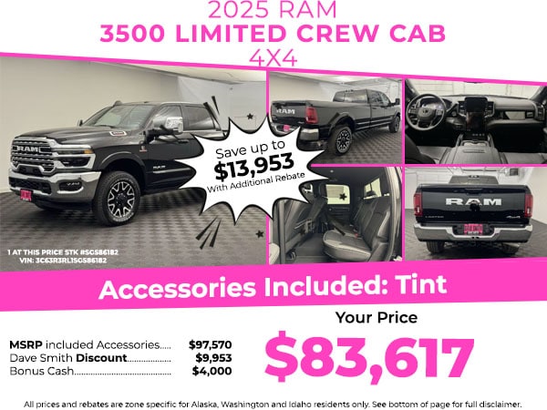 The installed navigation system will keep you on the right path. The leather seats in it are a must for buyers looking for comfort, durability, and style. Protect this unit from unwanted accidents with a cutting edge backup camera system. This model is pure luxury with a heated steering wheel. This Ram 3500's Forward Collision Warning feature alerts drivers to potential front-end collisions. Apple CarPlay: Seamless smartphone integration for this unit - stay connected and entertained on the go! Bluetooth technology is built into this model, keeping your hands on the steering wheel and your focus on the road. The Ram 3500 has auto-adjust speed for safe following. It offers Android Auto for seamless smartphone integration. This vehicle has four wheel drive capabilities. This model has an elegant black exterior finish. Set the temperature exactly where you are most comfortable in this unit. The fan speed and temperature will automatically adjust to maintain your preferred zone climate.