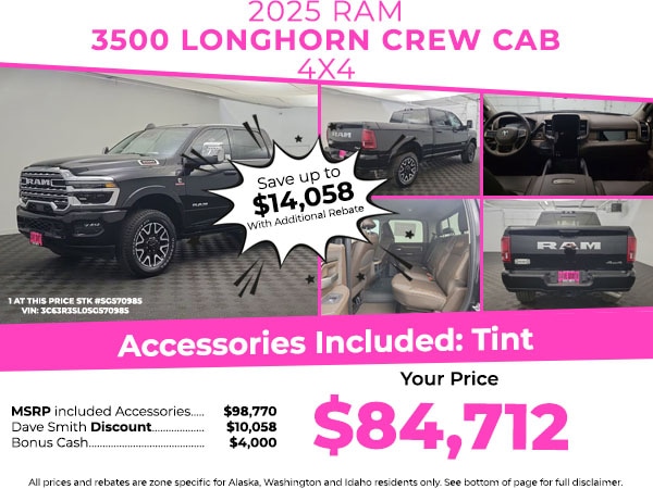 This vehicle's Forward Collision Warning feature alerts drivers to potential front-end collisions. See what's behind you with the back up camera on this 2025 Ram 3500 . The installed navigation system will keep you on the right path. Apple CarPlay: Seamless smartphone integration for this 2025 Ram 3500 - stay connected and entertained on the go! This model has automated speed control that adjusts to maintain a safe following distance, enhancing highway driving convenience. The leather seats in this vehicle are a must for buyers looking for comfort, durability, and style. Keep your hands warm all winter with a heated steering wheel in this model . This Ram 3500 comes equipped with Android Auto for seamless smartphone integration on the road. Bluetooth technology is built into this vehicle, keeping your hands on the steering wheel and your focus on the road. Set the temperature exactly where you are most comfortable in this Ram 3500. The fan speed and temperature will automatically adjust to maintain your preferred zone climate.