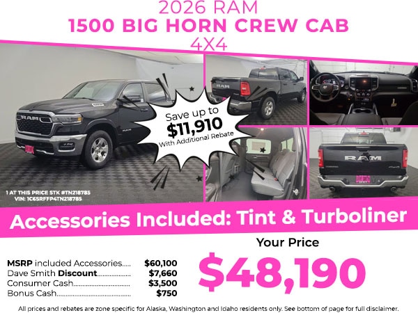 Quick Order Package 21Z Big Horn. Big Horn Level 1 Equipment Group: SiriusXM Radio Service; Rear Window Defroster; Rear View Auto Dim Mirror; Power Adjustable Pedals; Leather Wrapped Steering Wheel; Rear Power Sliding Window; Rear Dome with On/off Switch Lamp; Glove Box Lamp; Auto Power-Folding Mirrors; Exterior Mirrors with Heating Element; Auto Dim Exterior Driver Mirror; Heated Front Seats; Heated Steering Wheel; Black Exterior Mirrors; Black Premium Power Mirrors; SiriusXM Satellite Radio; 400W Inverter; Deluxe Cloth Bucket Seats; Exterior Mirrors with Supplemental Signals; Steering Wheel Mounted Audio Controls; Exterior Mirrors Courtesy Lamps; Body Color Fender Flares; 115V Auxiliary Power Outlet; Universal Garage Door Opener; 2nd Row in Floor Storage Bins; Convex Wide-Angle Exterior Mirror Insert; Sun Visors with Illuminated Vanity Mirrors. Quick Order Package 23Z Big Horn. Trailer Brake Control. Diamond Black Crystal PC. Rear Wheelhouse Liners. 3.55 Rear Axle Ratio. **Equipment listed is based on original vehicle build and subject to change. Please confirm the accuracy of the included equipment by calling the dealer prior to purchase.**