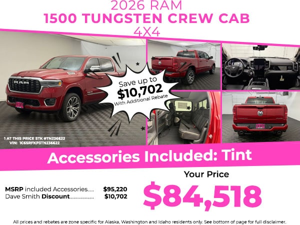 Off Road Group: Off Road Decals; Steering Gear Skid Plate; Falken Brand Tires; Raised Ride Height; 285/45R22XL BSW All Terrain Tires; Front Extra Heavy Duty Shock Absorbers; 20 Full Size Aluminum Spare Wheel; Rear Extra Heavy Duty Shock Absorbers; Full Size Spare Tire; E-Locker Rear Axle; Transfer Case Skid Plate; Fuel Tank Skid Plate; Selec-Speed Control. Bed Utility Group: Truck Bed Cargo Divider; MOPAR 4 Adjustable Cargo Tie-Down Hooks; Exterior 115V AC Outlet; MOPAR Deployable Bed Step Center Mount. Quick Order Package 22V Tungsten. Multi-Function Tailgate. E-Locker Rear Axle. Trailer Brake Control. Molten Red Pearlcoat. **Equipment listed is based on original vehicle build and subject to change. Please confirm the accuracy of the included equipment by calling the dealer prior to purchase.**
