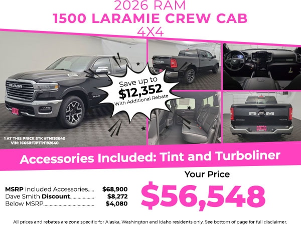 Laramie Level 1 Equipment Group: Remote Tailgate Release; Secondary Active Grille Shutters; Rain Sensitive Windshield Wipers; Wireless Charging Pad. Quick Order Package 21H Laramie. Anti-Spin Differential Rear Axle. Trailer Brake Control. Diamond Black Crystal PC. **Equipment listed is based on original vehicle build and subject to change. Please confirm the accuracy of the included equipment by calling the dealer prior to purchase.**
