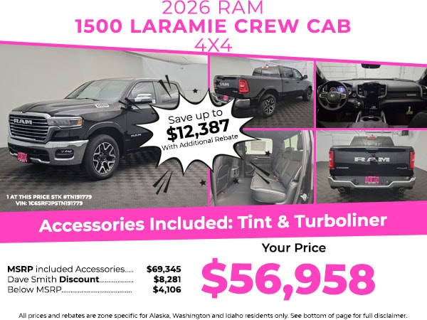 Laramie Level 1 Equipment Group: Remote Tailgate Release; Secondary Active Grille Shutters; Rain Sensitive Windshield Wipers; Wireless Charging Pad. Quick Order Package 21H Laramie. Anti-Spin Differential Rear Axle. 33 Gallon Fuel Tank. Trailer Brake Control. Diamond Black Crystal PC. **Equipment listed is based on original vehicle build and subject to change. Please confirm the accuracy of the included equipment by calling the dealer prior to purchase.**