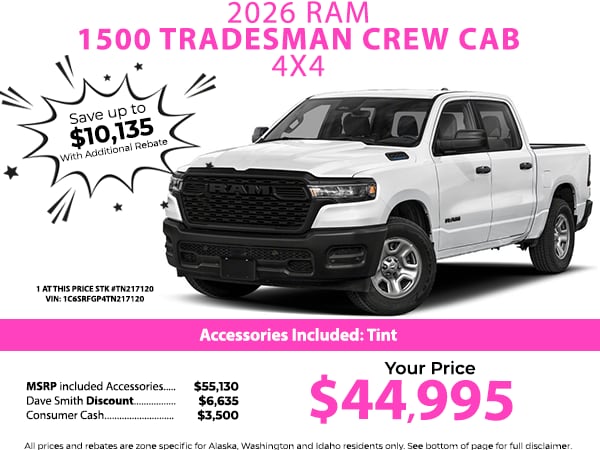 Quick Order Package 21D Express: Front Center Seat Cushion Storage; Front LED Fog Lamps; Grille Surround 1 Body Color Texture 1 Black; Black Interior Accents; 20 X 9.0 Aluminum Polished Painted Wheels; Body Color Front Bumper; Body Color Rear Bumper with Step Pads. Tradesman Level 1 Equipment Group: SiriusXM Radio Service; SiriusXM Satellite Radio; Rear Power Sliding Window; 2nd Row in Floor Storage Bins; Cloth Bench Seat; Front and Rear Floor Mats. Quick Order Package 23D Express. 33 Gallon Fuel Tank. Trailer Brake Control. 3.55 Rear Axle Ratio. **Equipment listed is based on original vehicle build and subject to change. Please confirm the accuracy of the included equipment by calling the dealer prior to purchase.**