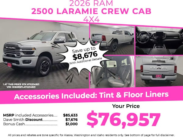 An off-road package is equipped on the Ram 2500. The Ram 2500 has auto-adjust speed for safe following. This model offers Android Auto for seamless smartphone integration. The leather seats in this 3/4 ton pickup are a must for buyers looking for comfort, durability, and style. with XM/Sirus Satellite Radio you are no longer restricted by poor quality local radio stations while driving the vehicle. Anywhere on the planet, you will have hundreds of digital stations to choose from. See what's behind you with the back up camera on this 3/4 ton pickup. Keep your hands warm all winter with a heated steering wheel in this unit . Start the vehicle from inside with remote start. Enjoy your music even more with the premium sound system in this unit. The vehicle's Forward Collision Warning system alerts the driver to potential front-end collisions, enhancing safety. Apple CarPlay: Seamless smartphone integration for this 2026 Ram 2500 - stay connected and entertained on the go!