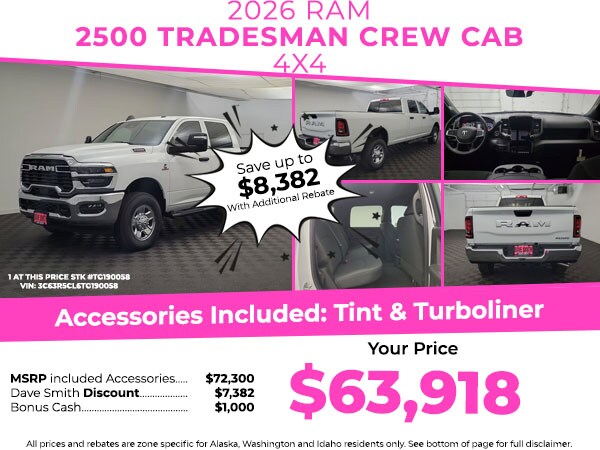 Cold Weather Group: Engine Block Heater; MOPAR Winter Front Grille Cover. Tradesman Level 2 Equipment Group: Google Android Auto; SiriusXM Radio Service; Firestone Brand Tires; For Details. Visit DriveUconnect.com; For More Info. Call 800-643-2112; Integrated Voice Command with Bluetooth; Emergency Vehicle Alert System (EVAS); Manual Folding Exterior Mirrors; 12 Touchscreen Display; Anti-Spin Differential Rear Axle; Mirror Running Lights; Exterior 115V AC Outlet; Alexa Built-In; Apple CarPlay; Power-Adjustable Convex Aux Mirrors; Cloth 40/20/40 Bench Seat; Disassociated Touchscreen Display; Matte Black Mesh Grille with Chrome; 115-Volt Auxiliary Front Power Outlet; Center Hub; LT275/70R18E BSW AS Tires; Rear View Auto Dim Mirror; Rear Power Sliding Window; Connectivity - US/Canada; Tinted Acoustic Windshield Glass; GPS Navigation; 4G LTE Wi-Fi Hot Spot; GPS Antenna Input; Bright Rear Bumper; Exterior Mirrors with Heating Element; Chrome Grille Surround; MOPAR Black Tubular Side Steps; SiriusXM with 360L; Global Telematics Box Module; Connected Travel and Traffic Services; Black Exterior Mirrors; 18 X 8.0 Steel Chrome Clad Wheels; Carpet Floor Covering; Off-Road Info Pages; Selectable Tire Fill Alert; Trailer Tow Pages; 400W Inverter; HD Radio; Power Heated Folding Telescope Mirrors; Uconnect 5 Navigation with 12.0 Display Radio; Exterior Mirrors with Supplemental Signals; Exterior Mirrors Courtesy Lamps; Air Conditioning ATC with Dual Zone Control; Manuarl Telescoping Mirrors; Power Adjust Mirrors; 18 Steel Spare Wheel; Front and Rear Floor Mats; Bright Front Bumper; ParkSense Front/rear Park Assist System. Convenience Group. Quick Order Package 24A Tradesman. Commercial Features Package. MOPAR Black Tubular Side Steps. Anti-Spin Differential Rear Axle. Cloth 40/20/40 Bench Seat. Instrument Panel Mounted Auxiliary Switches. Rear Wheelhouse Liners. **Equipment listed is based on original vehicle build and subject to change. Please confirm the accuracy of the included equipment by calling the dealer prior to purchase.**