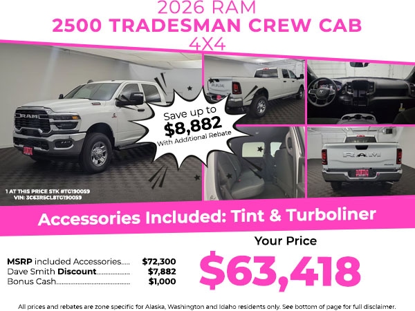 Cold Weather Group: Engine Block Heater; MOPAR Winter Front Grille Cover. Tradesman Level 2 Equipment Group: Google Android Auto; SiriusXM Radio Service; Firestone Brand Tires; For Details. Visit DriveUconnect.com; For More Info. Call 800-643-2112; Integrated Voice Command with Bluetooth; Emergency Vehicle Alert System (EVAS); Manual Folding Exterior Mirrors; 12 Touchscreen Display; Anti-Spin Differential Rear Axle; Mirror Running Lights; Exterior 115V AC Outlet; Alexa Built-In; Apple CarPlay; Power-Adjustable Convex Aux Mirrors; Cloth 40/20/40 Bench Seat; Disassociated Touchscreen Display; Matte Black Mesh Grille with Chrome; 115-Volt Auxiliary Front Power Outlet; Center Hub; LT275/70R18E BSW AS Tires; Rear View Auto Dim Mirror; Rear Power Sliding Window; Connectivity - US/Canada; Tinted Acoustic Windshield Glass; GPS Navigation; 4G LTE Wi-Fi Hot Spot; GPS Antenna Input; Bright Rear Bumper; Exterior Mirrors with Heating Element; Chrome Grille Surround; MOPAR Black Tubular Side Steps; SiriusXM with 360L; Global Telematics Box Module; Connected Travel and Traffic Services; Black Exterior Mirrors; 18 X 8.0 Steel Chrome Clad Wheels; Carpet Floor Covering; Off-Road Info Pages; Selectable Tire Fill Alert; Trailer Tow Pages; 400W Inverter; HD Radio; Power Heated Folding Telescope Mirrors; Uconnect 5 Navigation with 12.0 Display Radio; Exterior Mirrors with Supplemental Signals; Exterior Mirrors Courtesy Lamps; Air Conditioning ATC with Dual Zone Control; Manuarl Telescoping Mirrors; Power Adjust Mirrors; 18 Steel Spare Wheel; Front and Rear Floor Mats; Bright Front Bumper; ParkSense Front/rear Park Assist System. Convenience Group. Quick Order Package 24A Tradesman. Commercial Features Package. MOPAR Black Tubular Side Steps. Anti-Spin Differential Rear Axle. Cloth 40/20/40 Bench Seat. Instrument Panel Mounted Auxiliary Switches. Rear Wheelhouse Liners. **Equipment listed is based on original vehicle build and subject to change. Please confirm the accuracy of the included equipment by calling the dealer prior to purchase.**