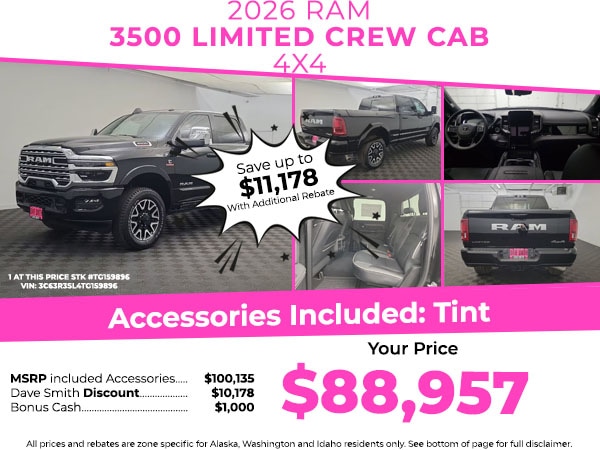 The leather seats in the vehicle are a must for buyers looking for comfort, durability, and style. This 1 ton pickup has auto-adjust speed for safe following. The installed navigation system will keep you on the right path. This model comes equipped with Android Auto for seamless smartphone integration on the road. This 1 ton pickup is pure luxury with a heated steering wheel. Never get into a cold vehicle again with the remote start feature on this 1 ton pickup. This vehicle's Forward Collision Warning system alerts the driver to potential front-end collisions, enhancing safety. Bluetooth technology is built into this 1 ton pickup, keeping your hands on the steering wheel and your focus on the road. See what's behind you with the back up camera on this 2026 Ram 3500 . This unit offers Apple CarPlay for seamless connectivity. When you encounter slick or muddy roads, you can engage the four wheel drive on this model and drive with confidence.