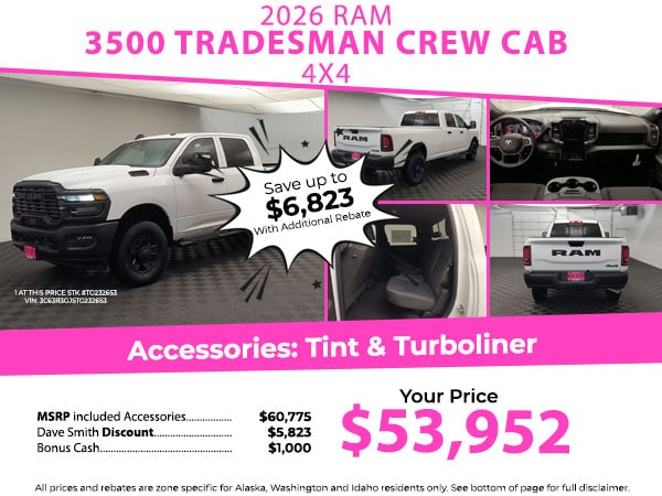 An off-road package is equipped on it. The vehicle has automated speed control that adjusts to maintain a safe following distance, enhancing highway driving convenience. It offers Apple CarPlay for seamless connectivity. This 2026 Ram 3500 offers Android Auto for seamless smartphone integration. This model offers Automatic Climate Control for personalized comfort. See what's behind you with the back up camera on this model. The rear parking assist technology on this 1 ton pickup will put you at ease when reversing. The system alerts you as you get closer to an obstruction. This unit features a hands-free Bluetooth phone system. This 2026 Ram 3500 is equipped with the latest generation of XM/Sirius Radio. The installed navigation system will keep you on the right path. Set the temperature exactly where you are most comfortable in the Ram 3500. The fan speed and temperature will automatically adjust to maintain your preferred zone climate.