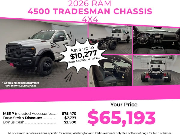 This model has auto-adjust speed for safe following. The vehicle comes equipped with Android Auto for seamless smartphone integration on the road. It features a hands-free Bluetooth phone system. Apple CarPlay: Seamless smartphone integration for it - stay connected and entertained on the go! See what's behind you with the back up camera on this vehicle. Start it from inside with remote start. This Ram 4500 Chassis's Forward Collision Warning system alerts the driver to potential front-end collisions, enhancing safety. This 2026 Ram 4500 Chassis has a 6 Cyl, 6.7L high output engine. Quickly unlock this vehicle with keyless entry. This model shines with clean polished lines coated with an elegant white finish. A trailer braking system is already installed on the vehicle. This vehicle has four wheel drive capabilities. This model has a diesel engine. The Electronic Stability Control will keep you on your intended path. The Ram 4500 Chassis features cruise control for long trips.