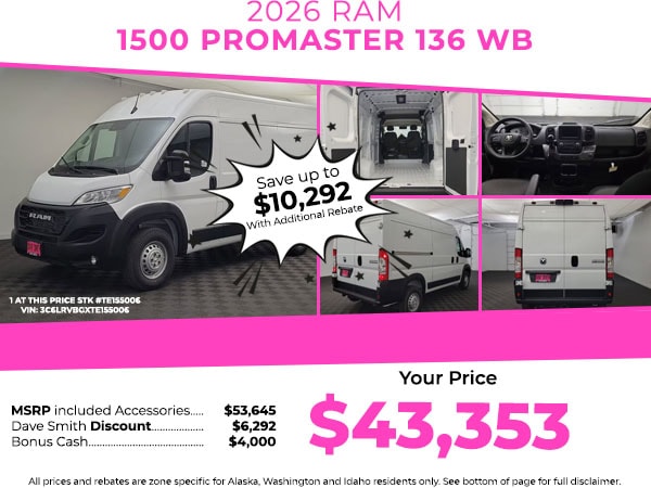New 2026 RamPromaster 1500 Cargo Van High Roof 136WB 3 Door Van; Cargo