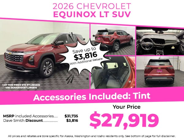 Protect it from unwanted accidents with a cutting edge backup camera system. The Chevrolet Equinox's Lane Departure Warning keeps you safe by alerting you when you drift from your lane. Keep your hands warm all winter with a heated steering wheel in the Chevrolet Equinox . Start this 2026 Chevrolet Equinox from inside with remote start. The state of the art park assist system will guide you easily into any spot. This mid-size suv has auto-adjust speed for safe following. This 2026 Chevrolet Equinox features a hands-free Bluetooth phone system. The installed navigation system will keep you on the right path. This model stays safely in its lane with Lane Keep Assist. Keep safely connected while in this vehicle with OnStar. You may enjoy services like Automatic Crash Response, Navigation, Roadside Assistance and Hands-Free Calling. This 2026 Chevrolet Equinox gleams with a flashy red exterior. This unit is front wheel drive.