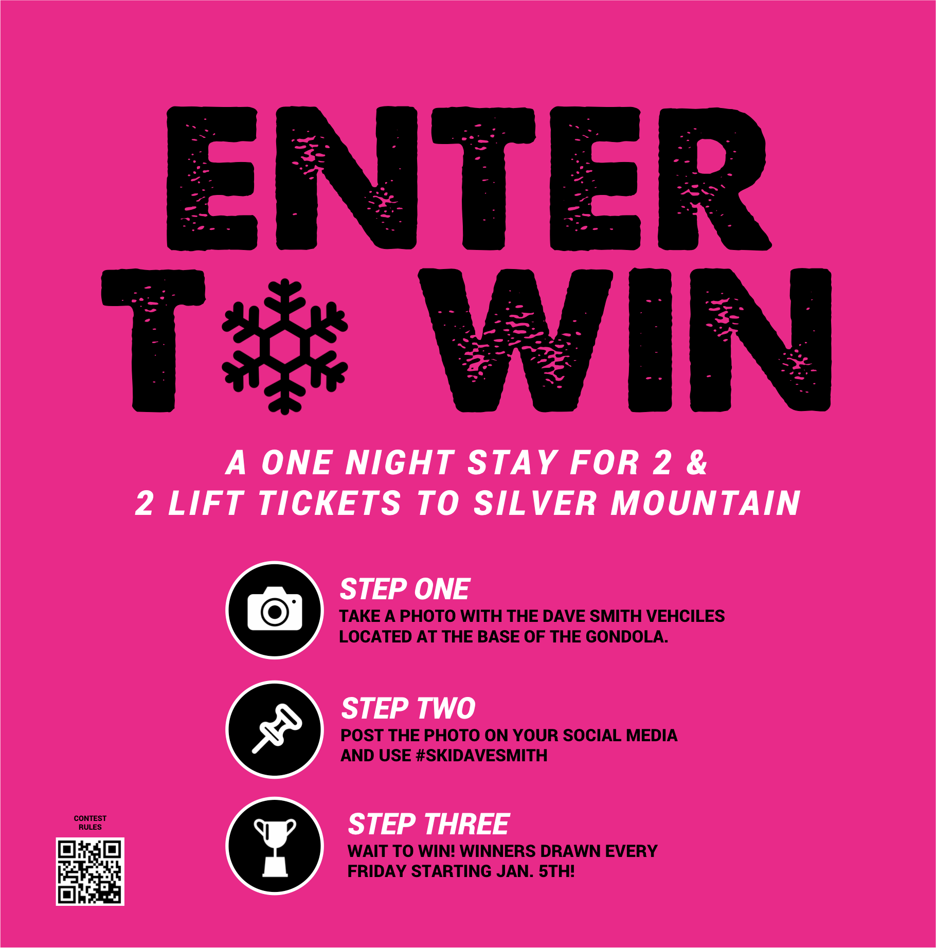 To enter take a photo at Silver Mountain with the hash tag #skidavesmith with one or all of the cars we have parked at the base of Silver Mountain in the background. We will be drawing a winner every Friday starting January 5, 2017 and going through the end of the ski season (last Friday Silver Mountain is open for the 2017-2018 season. Each week's winner will be contacted through the social media platform they posted on and will win a one site stay for 2 at Silver Mountain and 2 lift tickets for Silver Mountain.Â