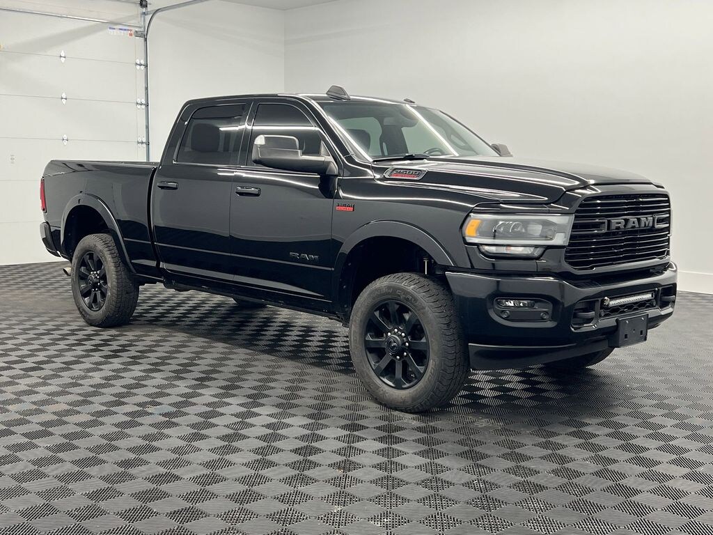 Quick Order Package 2ZH Laramie. Laramie Level 1 Equipment Group: Remote Tailgate Release; Auto High Beam Headlamp Control; Blind Spot and Cross Path Detection; Rain Sensitive Windshield Wipers; Power Adjustable Pedals with Memory; Foam Bottle Insert (door Trim Panel); 2nd Row in Floor Storage Bins; Radio/driver Seat/mirrors/pedals Memory; Ventilated Front Seats. Night Edition: Mirror-Mounted Aux Reverse Lamps; Black Ram Head Tailgate Badge; 20 X 8.0 Black Painted Aluminum Wheels; Black Headlamp Bezels; Body Color Door Handles; Painted Front Bumper; Painted Rear Bumper; LT285/60R20E OWL On/off Road Tires; Black Exterior Truck Badging; Exterior Mirrors with Memory; Gloss Black Grille Billets/accents; Body Color Grille Surround; Black Interior Accents; Black Exterior Mirrors; Black Tail Lamp Bezels; Power Black Tow Mirrors with Convex Spotter and Memory; Power Adjustable Convex Aux Mirrors. Protection Group: Tow Hooks; Transfer Case Skid Plate Shield. Uconnect 4C Navigation Radio with 8.4 Display. Blind Spot and Cross Path Detection. Anti-Spin Differential Rear Axle. Center Stop Lamp with Cargo View Camera. LED Bed Lighting. Front and Rear Rubber Floor Mats. Instrument Panel Mounted Auxiliary Switches. Diamond Black Crystal PC. Diamond Black Crystal PC. **Equipment listed is based on original vehicle build and subject to change. Please confirm the accuracy of the included equipment by calling the dealer prior to purchase.**